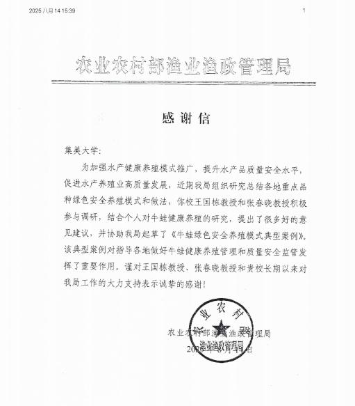 近日,农业农村部渔业渔政管理局向我校发来感谢信,对我校王国栋教授、张春晓教授在推广水产健康养殖模式、提升水产品质量安全水平、促进水产养殖业高质量发展工作中的积极贡献表示感谢。